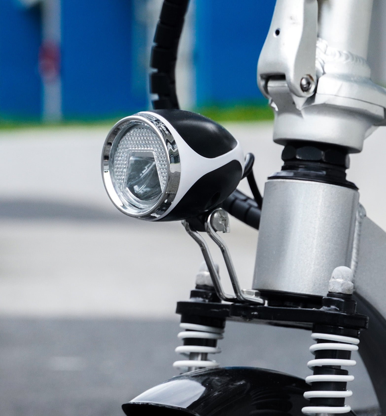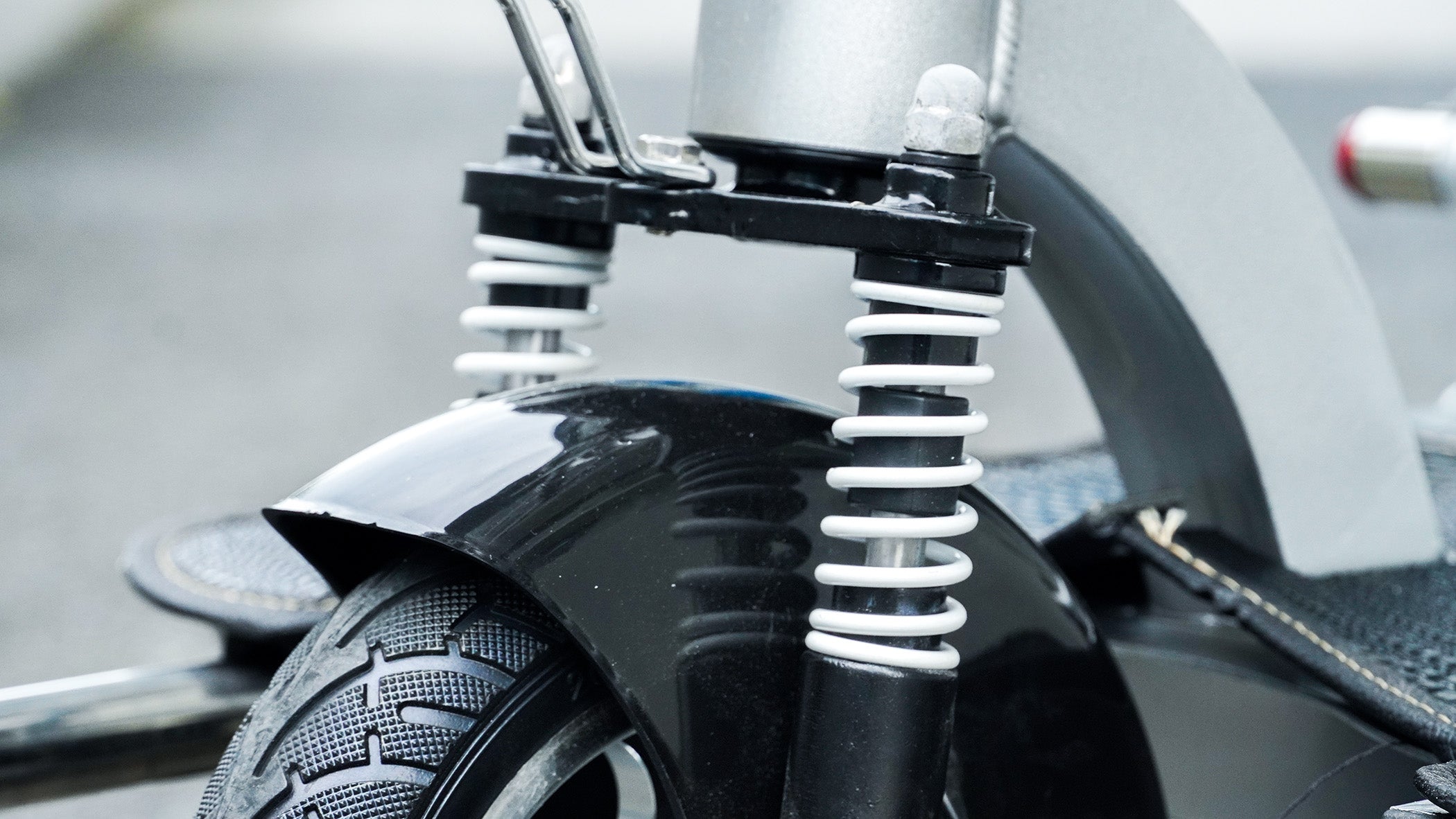 Front wheel suspension absorbs shocks from bumps, providing a smoother and more comfortable ride.