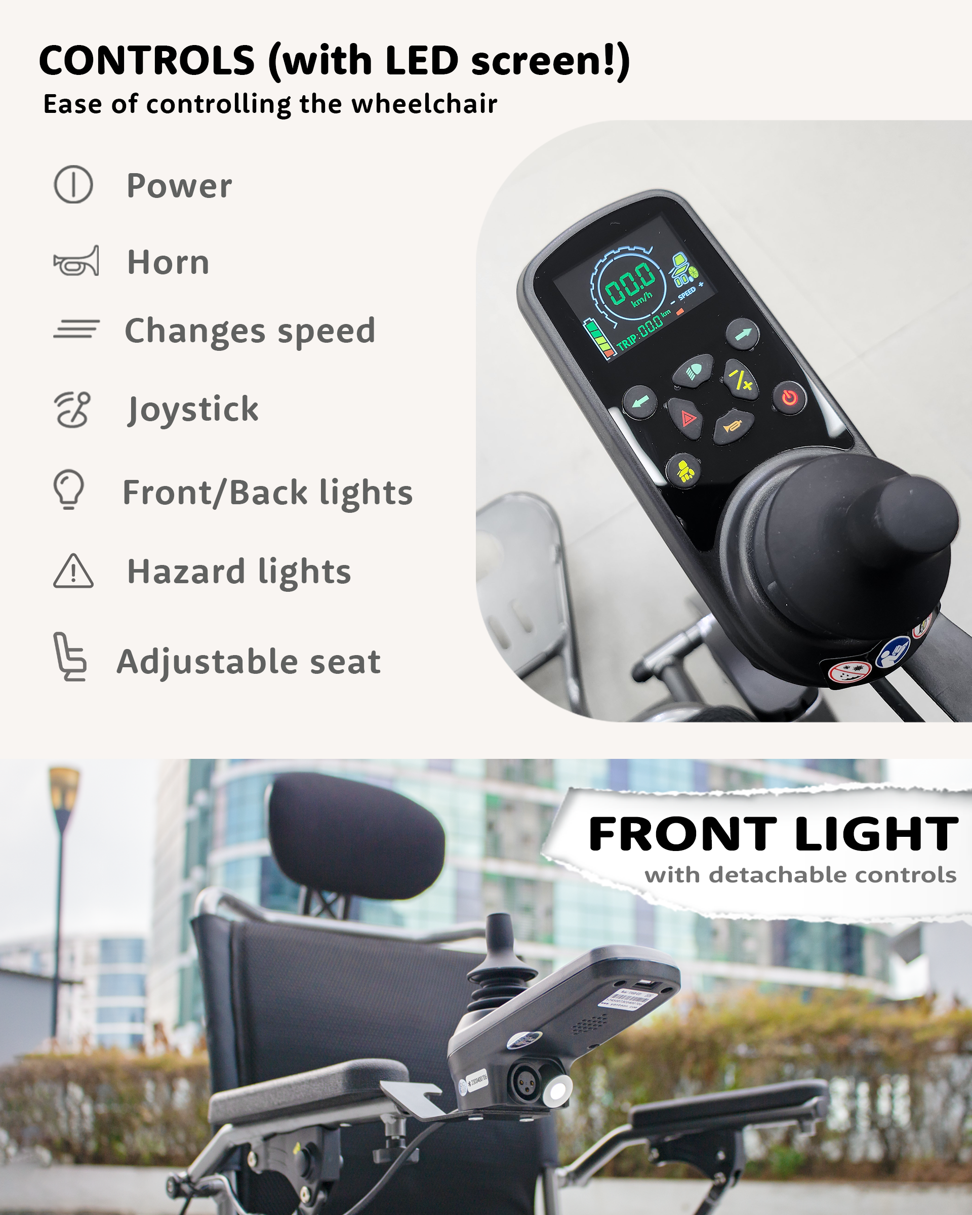 - Handheld remote control allows caregivers to operate the wheelchair from a distance