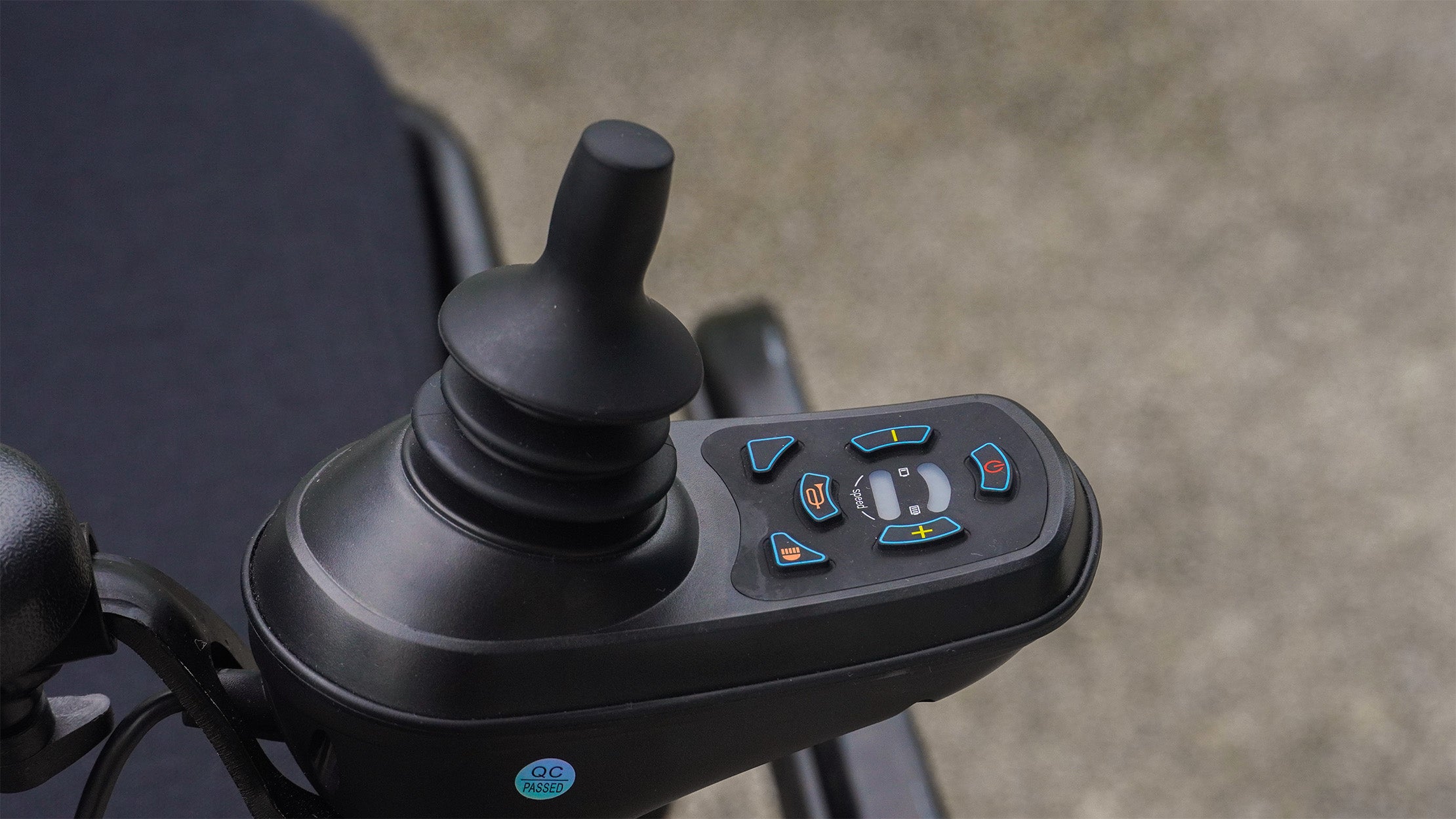 - Adjustable joystick controller can be mounted on either armrest to suit user preference