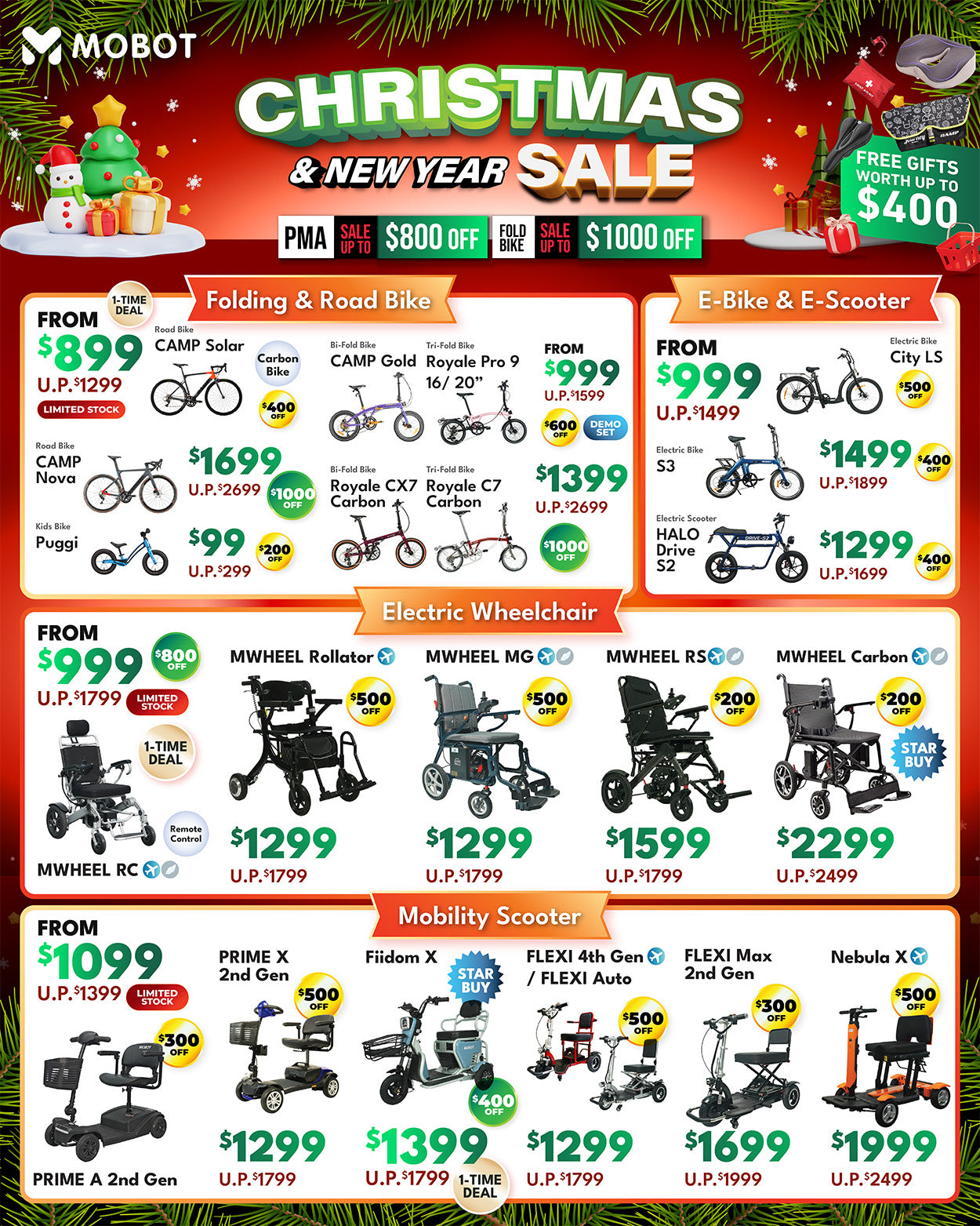 Get ready for amazing savings at MOBOT’s Christmas & New Year Sale! Enjoy exclusive offers with up to $1000 off Electric Wheelchairs and , e-bikes, e-scooters, mobility scooters, and motorised electric wheelchairs. 🚲⚡ Don’t miss this limited-time chance to save big!