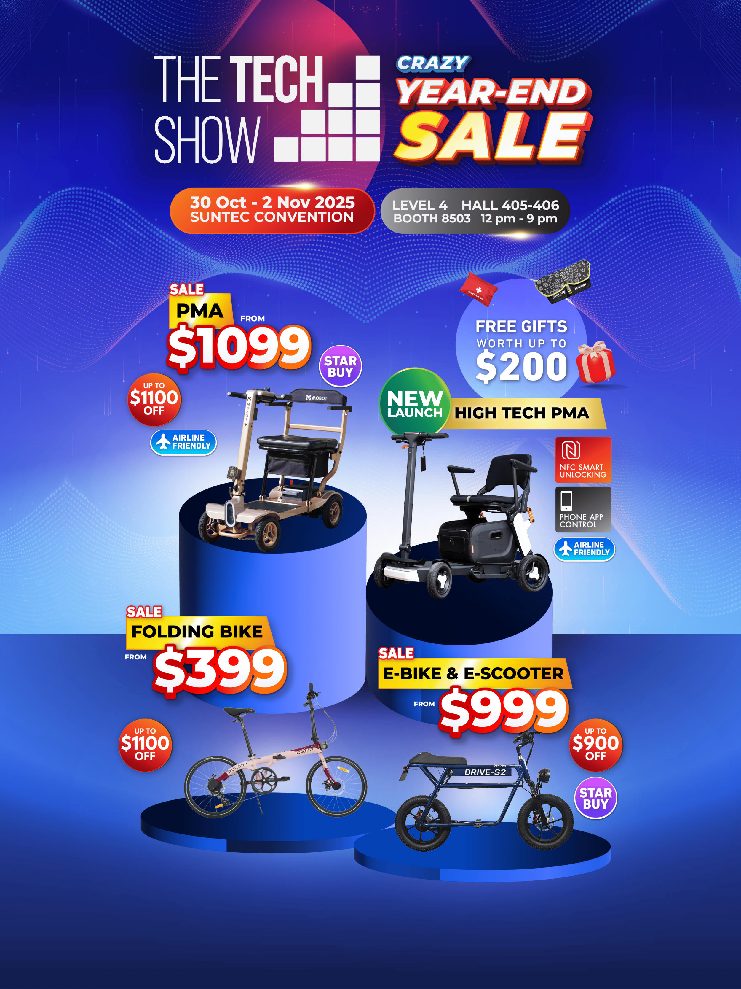 From 14th to 22nd October, enjoy our exclusive The Tech Show Deals! With up to 50% off selected products, along with any CAMP foldable bicycle for an all-time low price of only $999!