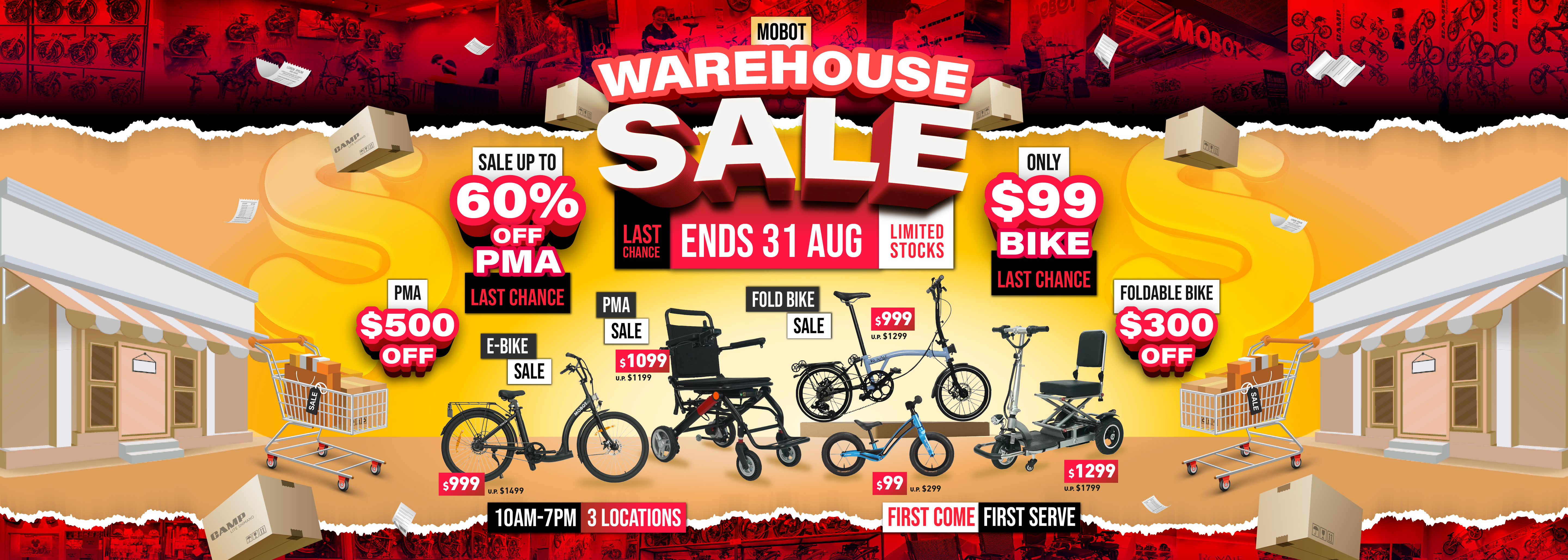 From now until 31st August, enjoy Up To 60% or $1000 off foldable bikes, e-bikes, PMA, mobility scooters, motorised electric wheelchairs and grab as many accessories as you want for the $60 Grab Bag Challenge during MOBOT's Biggest Warehouse Sale! 10 DAYS ONLY 🔥