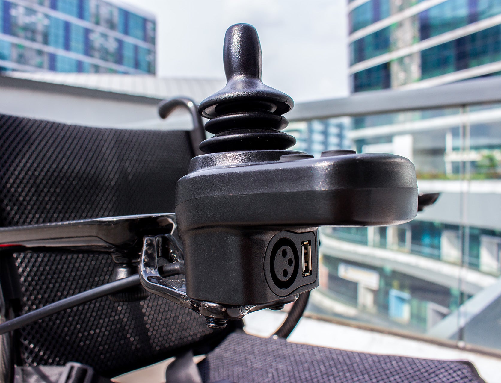 - Adjustable joystick controller can be inserted on either armrest to suit user preference