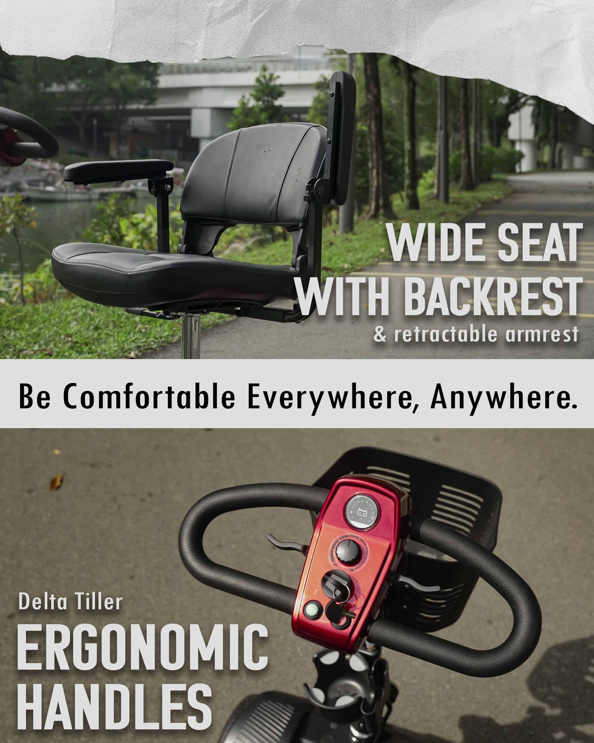 - Retractable armrests and adjustable front stem for rider comfort