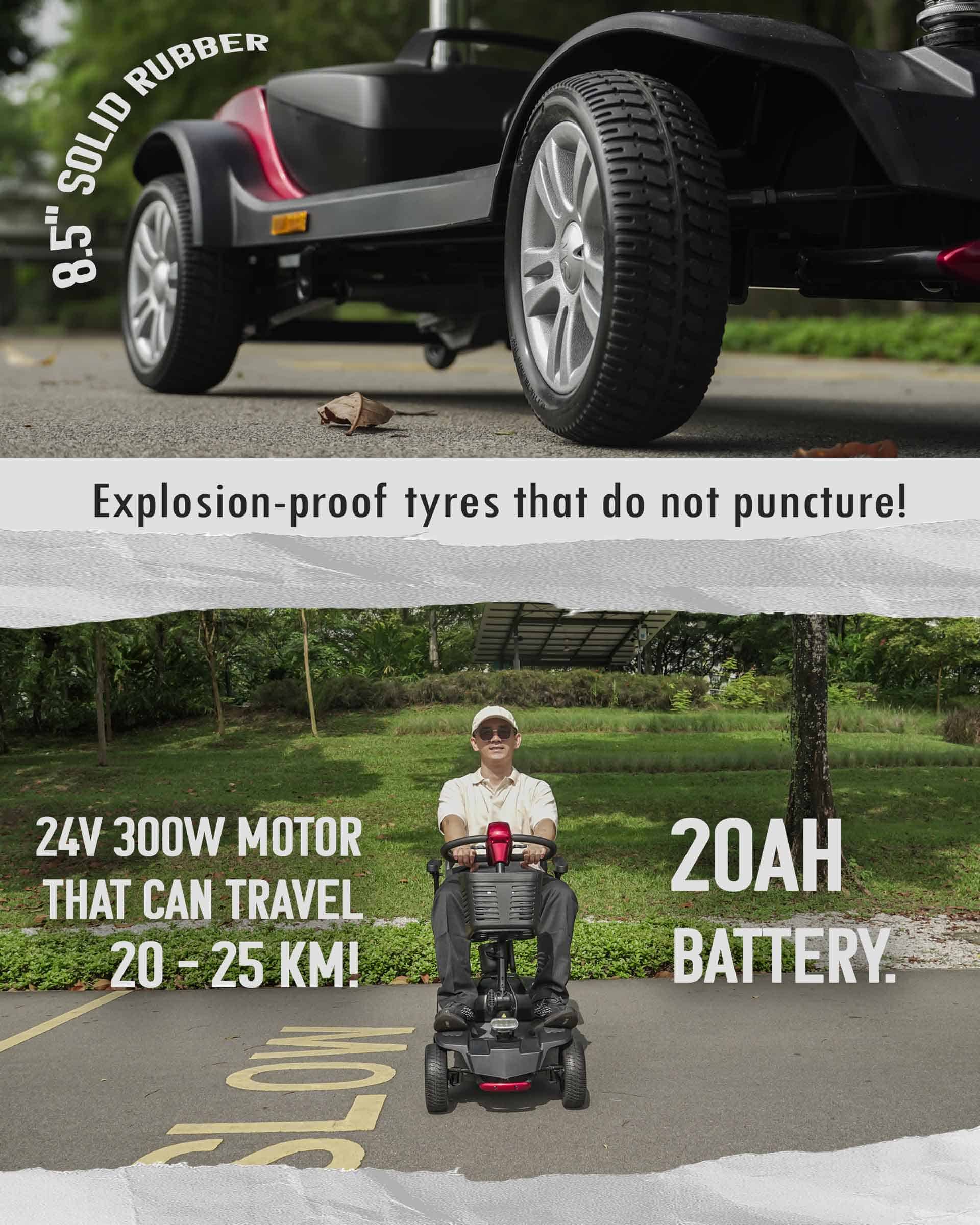 - Large 8.5” puncture-proof solid rubber tyres