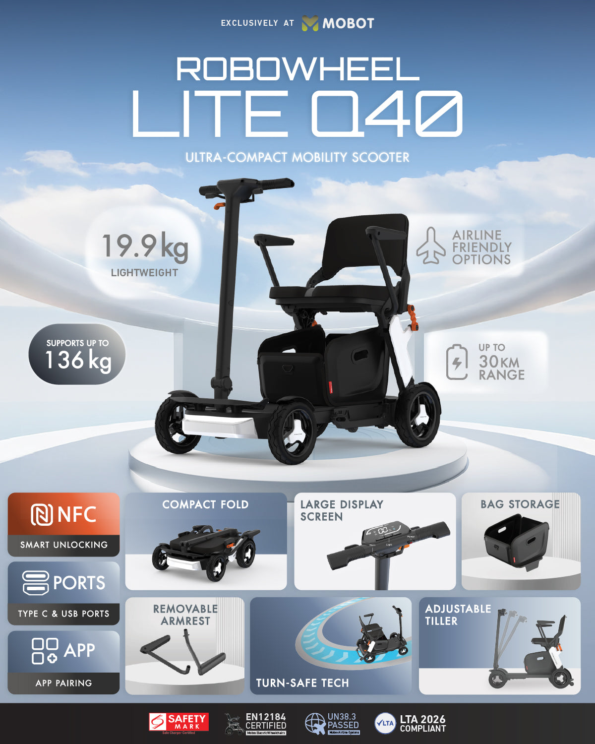 Meet the ROBOWHEEL Lite Q40 — the perfect blend of premium smart features with lightweight, compact convenience. With app control and NFC unlocking, it's built for modern lifestyles. Weighing just 20kg*, this sleek and lightweight mobility scooter redefines portability with the most compact slide-in folding, shrinking its length by 23.8cm! Paired with an airline-friendly battery option, the Lite Q40 is your most effortless and intelligent companion wherever you go.